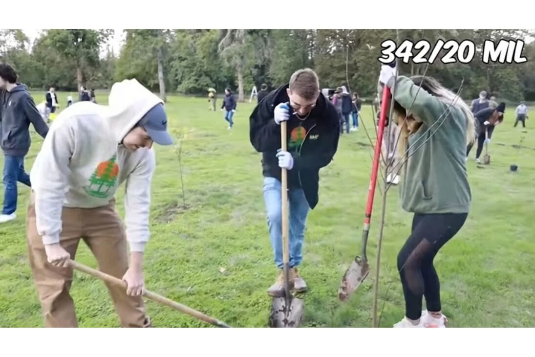 20 millones de árboles no salieron de a mano: en el primer día fueron solo 300 plántulas, incluso con agujero, cobertura y prueba de tirón. En el día dos, la multitud ayudó, pero la escala exigió dron, Mark Rober, asociación con la Arbor Day Foundation y teamtrees.org, donde US$ 1 se convierte en 1 árbol.