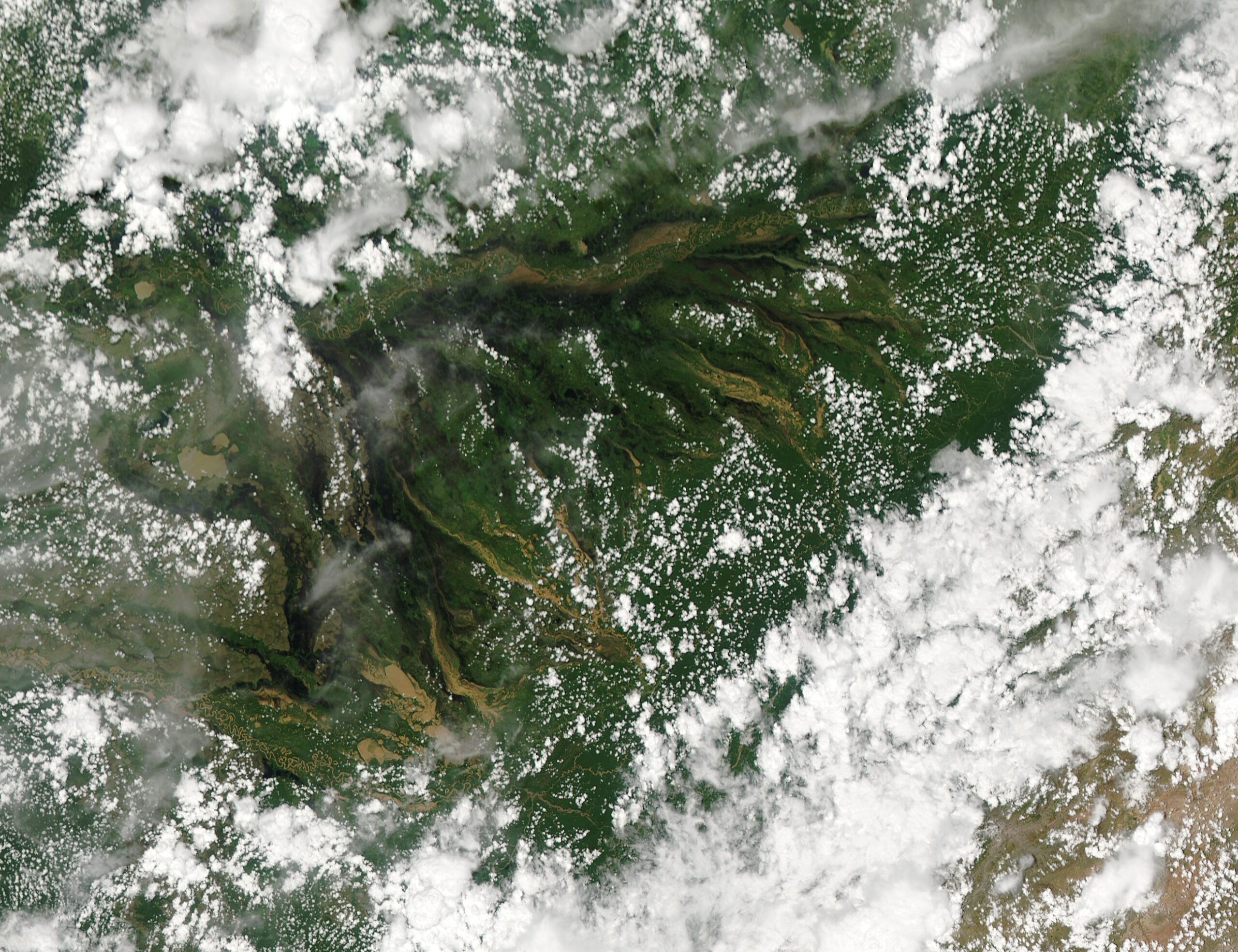 En Bolivia, los Llanos de Moxos forman una llanura de 6,9 millones de hectáreas conectada a la cuenca amazónica que se inunda cada año con pulsos hidrológicos de hasta 5 metros, creando un laberinto continental de ríos, lagos y canales estacionales visible desde el espacio.