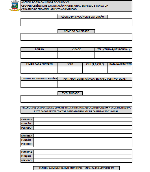Sine Cariacica: Los candidatos deberán completar el formulario a continuación y enviarlo al correo empregos@cariacica.es.gov.br, colocando en el asunto el código de la vacante, que podrá ser visto en el sitio y la función.