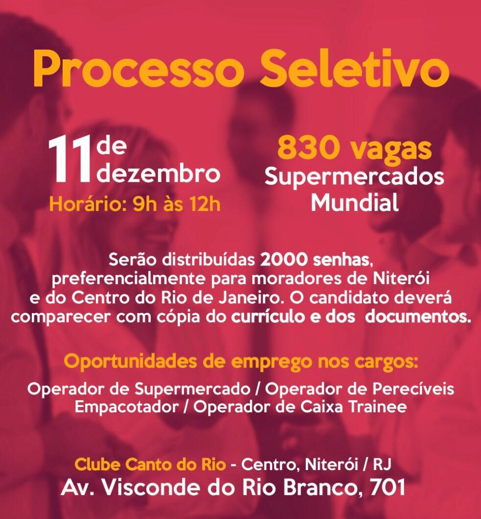 Serán nada, nada menos que 830 vacantes de empleo para la más reciente unidad de la gran red Supermercado Mundial, por primera vez alocará una tienda fuera de la capital carioca. El proceso selectivo se llevará a cabo el próximo martes (11), de 9h a 12h, en Avenida Visconde do Rio Branco, 701, Clube Canto do Rio, en el Centro de Niterói.