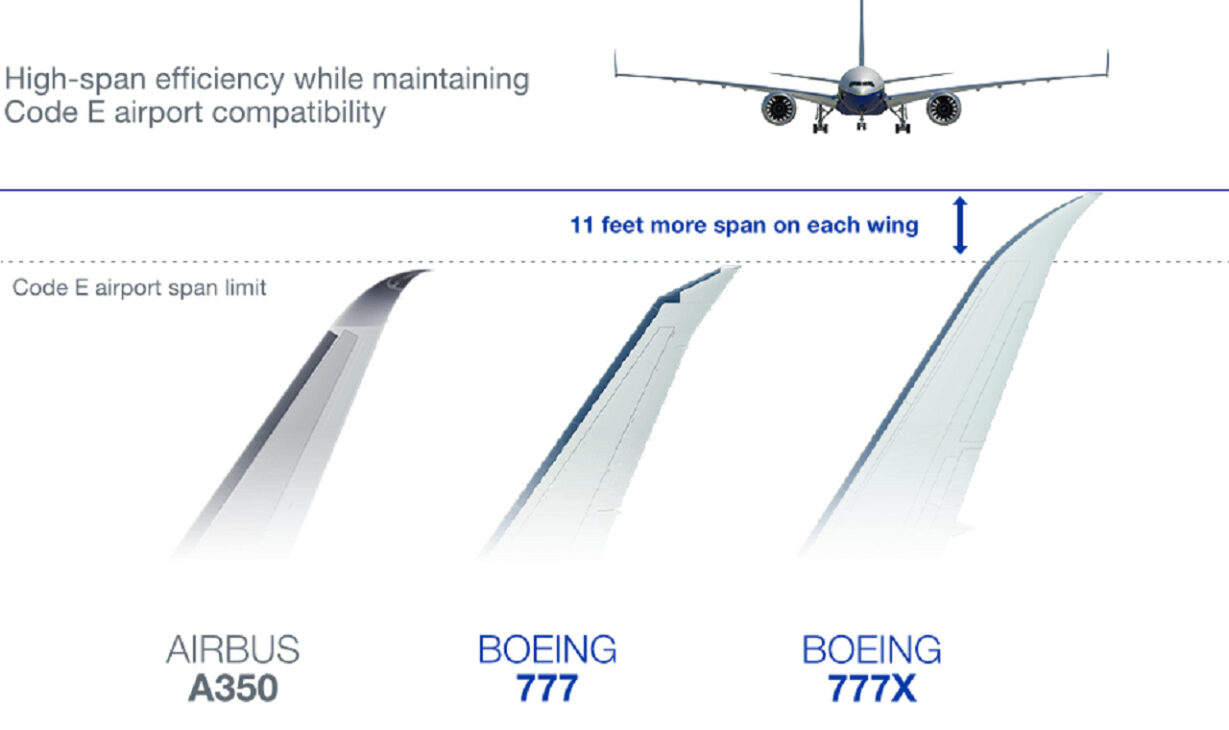 Una de las mayores curiosidades del Boeing 777X está en sus alas plegables, un recurso inédito en jets comerciales de gran porte. Hechas de materiales compuestos, similares a los utilizados en el 787 Dreamliner, las alas del 777X superan los 71 metros de envergadura total.