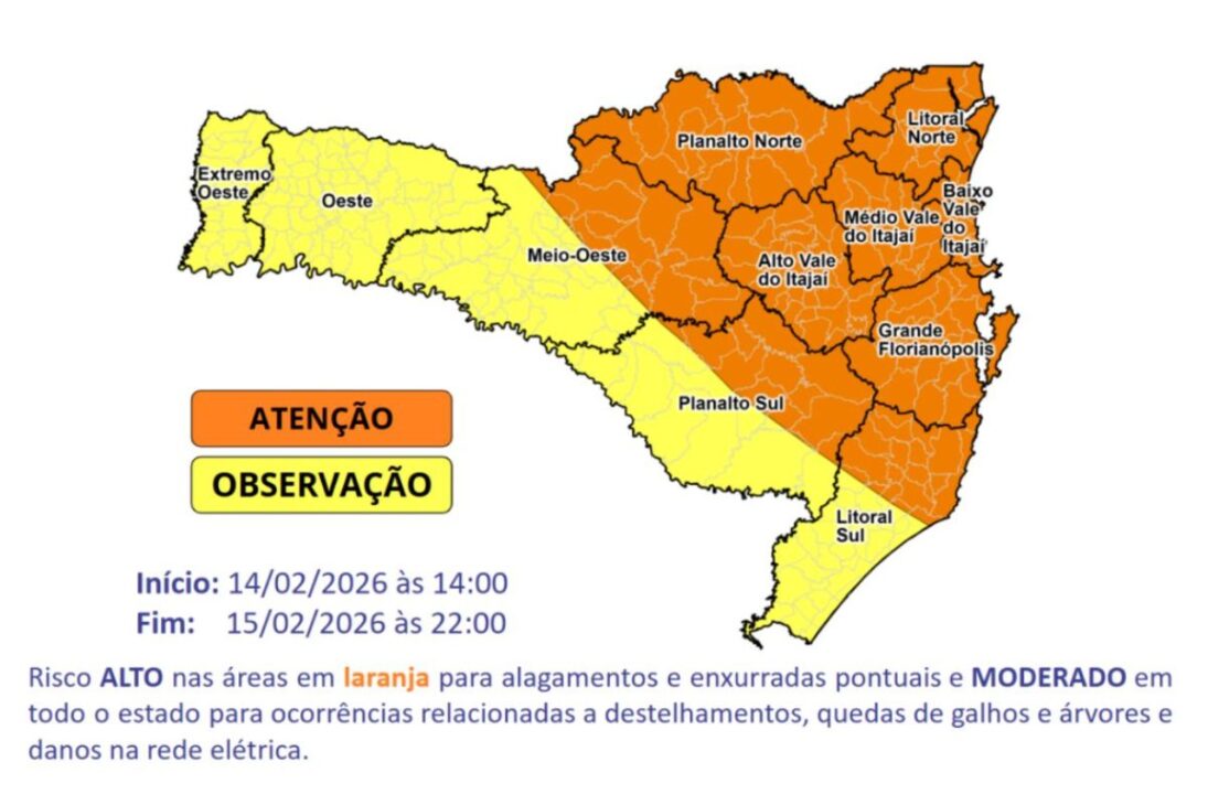 Entre 14h de sábado e 22h de domingo, la Defensa Civil proyecta inestabilidad en todas las regiones de SC, con alto riesgo en las áreas en naranja y riesgo moderado en los tramos en observación, bajo un patrón típico de verano marcado por calor, alta humedad y disturbios atmosféricos en varias capas verticales.