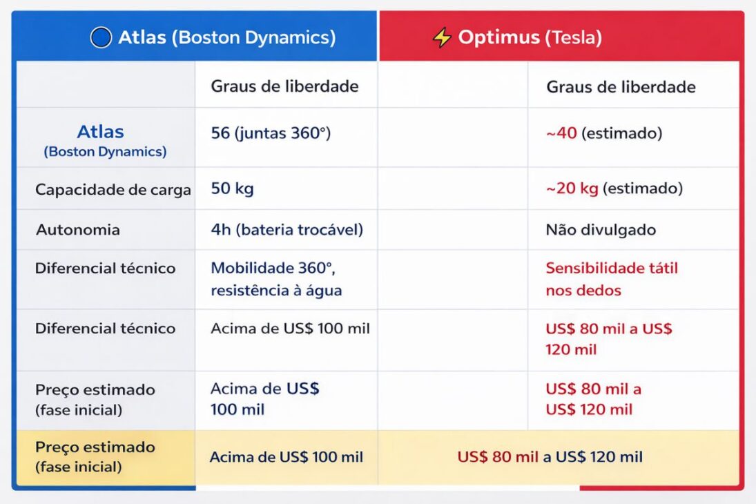 El Atlas enfatiza fuerza, amplitud y resiliencia operativa; el Optimus, según los datos estimados presentados, se centra más en destreza fina y potencial de escala industrial amplia. No se trata de «cuál es mejor», sino de «mejor para qué misión».