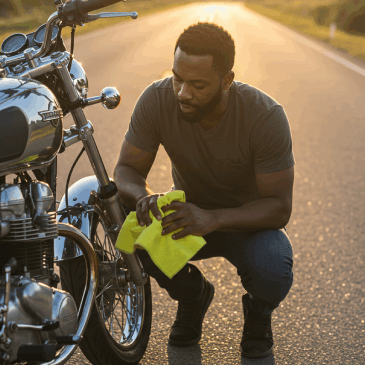 El paño amarillo es una señal de emergencia no oficial. Indica que el motociclista tiene problemas — como fallo mecánico, neumático pinchado o falta de combustible — y necesita ayuda, incluso si no puede solicitar asistencia de manera tradicional.