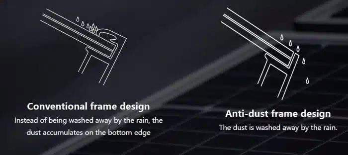 El secreto de la eficacia de estos módulos radica en su diseño de marco. El marco permite que la sedimentación de polvo simplemente se deslice con la lluvia, gracias a un borde corto que está al nivel de la superficie del vidrio, permitiendo que el polvo acumulado se deslice naturalmente bajo la influencia de la gravedad y la lluvia.