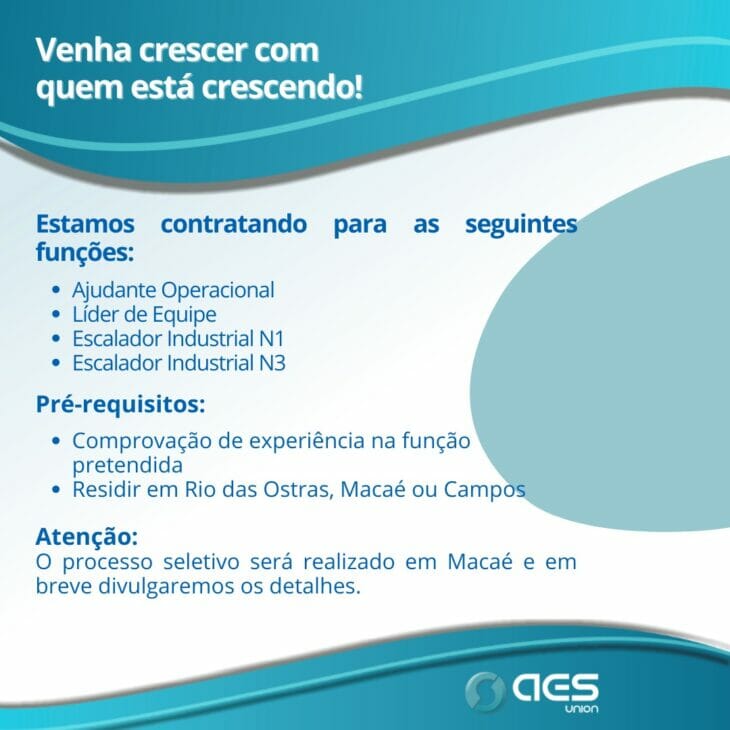 El proceso de selección está a punto de ocurrir en Macaé, ofreciendo numerosas oportunidades para aquellos en busca de empleo en la región. Desde líderes de equipo hasta ayudantes operacionales y escaladores industriales, AES está buscando nuevos talentos.