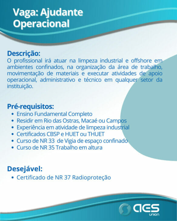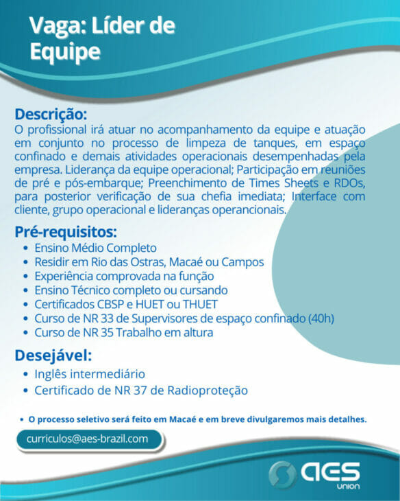 Las vacantes para este contrato están abiertas, y el proceso de selección comenzará pronto en Macaé. Si estás en busca de una oportunidad de trabajo en el área de limpieza industrial, liderazgo u operaciones offshore, esté atento a las publicaciones de AES. No pierdas esta oportunidad de integrar una empresa líder en el mercado, con inversiones significativas en Macaé y en el sector offshore.