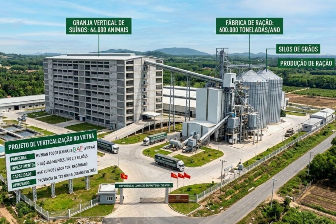 La asociación entre la china Muyuan Foods y la empresa local BAF prevé la construcción de un complejo con una inversión superior a US$ 450 millones, algo en torno a R$ 2,3 mil millones, según los valores informados en la base. El plan reúne dos frentes centrales: una granja con capacidad para 64 mil cerdos y una fábrica capaz de producir casi 600 mil toneladas de piensos por año.