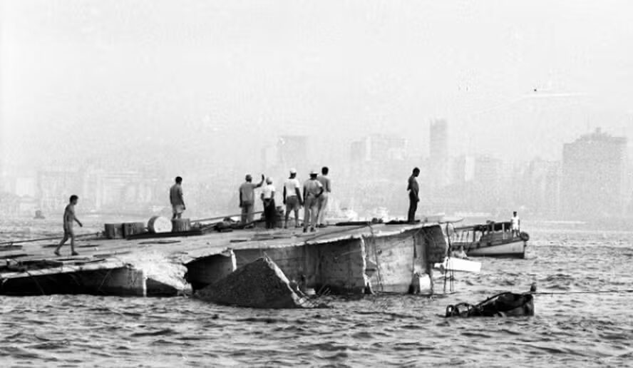 Imagen histórica muestra el lugar del colapso de una plataforma durante la construcción del Puente Río-Niterói, en 1970, tragedia que resultó en la muerte de ocho trabajadores.