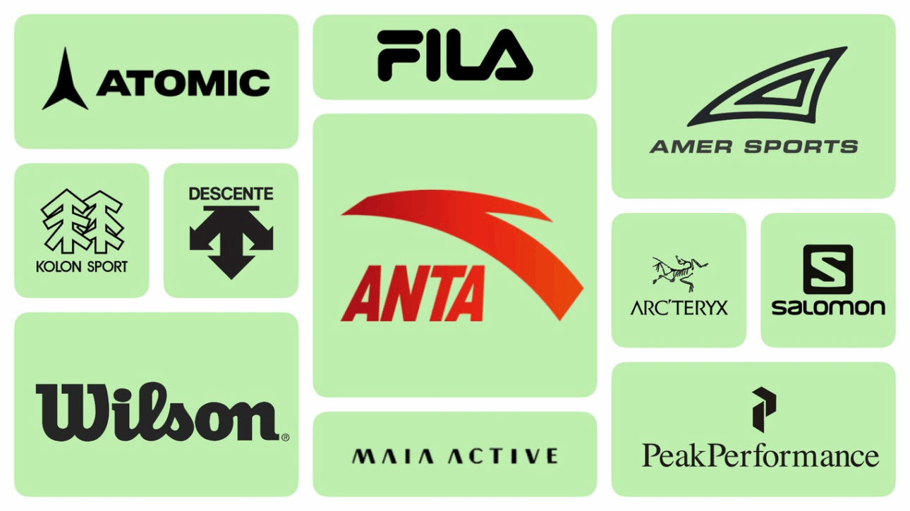 La compra de Amer Sports en 2019 (por 5,6 mil millones de euros) le dio a Anta el control de diversas marcas renombradas de Occidente, incluyendo: