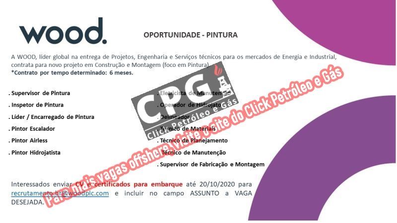 La empresa informa que las vacantes son para contratos de seis meses. Candidatos interesados en trabajar en el sector de petróleo y gas que deseen participar en el proceso selectivo para las vacantes de empleo atendiendo proyectos on y offshore de la líder global Wood Group, por favor envíen el currículum inmediatamente al siguiente correo electrónico reclutamiento.br@woodplc.com citando el nombre de la función en el asunto. ¡BUENA SUERTE!
