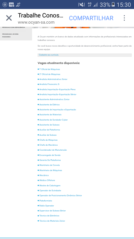 En primer lugar, si usted está accediendo a esta publicación desde un celular/smartphone, pare todo ahora y entre desde una computadora de escritorio o portátil en esta publicación nuevamente. En segundo lugar, necesitará ingresar al sitio VAGAS.COM y hacer un login y contraseña, si ya tiene es mejor aún. En tercer lugar, rellene los formularios adecuadamente, con sus experiencias profesionales, certificados y cursos. El último paso es HACER CLIC EN LA PÁGINA OFICIAL DE OCYAN AQUÍ Y DEJAR SU CURRÍCULO. Ella había publicado un montón de vacantes individualmente, pero se encargó de removerlas rápido, pensamos que era algún tipo de prueba para algo GRANDIOSO que está por venir. Por las dudas, inscríbanse para ver en qué resulta. Vean la captura de pantalla abajo: