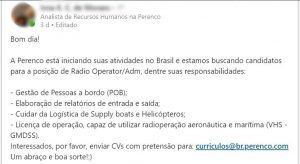 Después de un tiempo sin dar noticias después de haber adquirido algunos activos en aguas someras de Petrobras en noviembre de 2018, parece que ahora la británica Perenco comenzará a dar el primer paso en sus actividades de petróleo y gas en Brasil, comenzando por la vacante de Radio Operador. Es solo una oportunidad, pero con toda certeza es el precedente de lo que estará por venir en las próximas semanas/meses. Vean el enunciado: