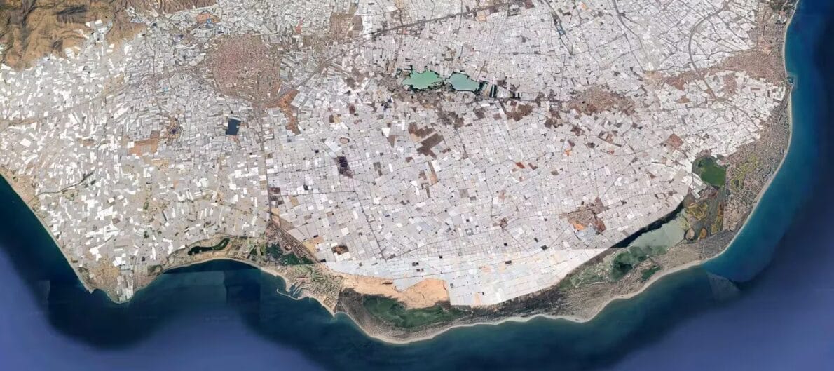 Se encuentra en el sur de España y es conocida como Mar de Plástico de Almería. El paisaje está formado por una inmensa área de invernaderos que cubre más de 40.000 hectáreas, creando una mancha blanca cercana al Mediterráneo.