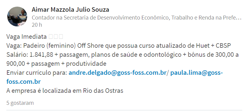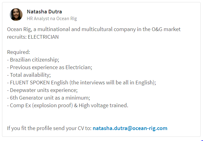 [supsystic-social-sharing id=’1′]Hoy Hay Vacantes Offshore En Muchos Departamentos Y Con Diferentes Funciones Con Procesos Selectivos Reales Y Actualizados, Pero También Hay Algunas Oportunidades Para Trabajar En Tierra Firme. Las Convocatorias De Las Empresas Aún Están En Vigencia Y Ustedes Podrán Conferirlas Adecuadamente Justo Abajo. Recordando Que La Semana Pasada, Dos Empresas, Una De Construcción Civil Y Otra De Construcción Y Montajes Industriales Abrieron Procesos Selectivos La Semana Pasada. Al Final De Este Artículo Voy A Disponibilizar Las Materias Para Que Ustedes Puedan Registrarse También Y Intentar La Suerte.