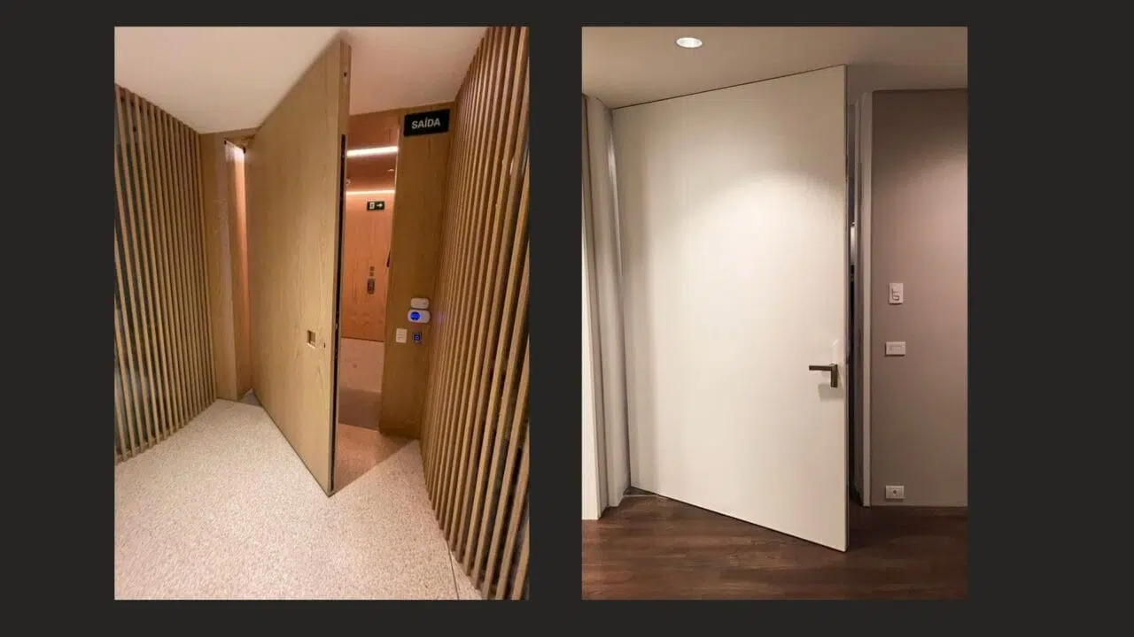 Uno de los principales problemas que Felipe Masetti enfrentaba en su área era con el peso de las puertas blindadas. Con balística de nivel 3 de la NBR 15000, de protección contra fusiles, es una puerta que el mercado aún fabrica con acero nacional y que pesa 250 kilos (una hoja tradicional de 2,10 X 80 de ancho). “Esta puerta convencional, con el acero nacional, significa no solo un inconveniente en el manejo – es preciso hacer un esfuerzo para moverla. Pero además, genera muchos incidentes, debido a manejar 250 kilos moviéndose y cuando está posicionada en el marco, se convierte en una guillotina. Si atrapa un dedo, el dedo no va a quedar morado. O el dedo se rompe o hasta se decapita. Es un peligro”.