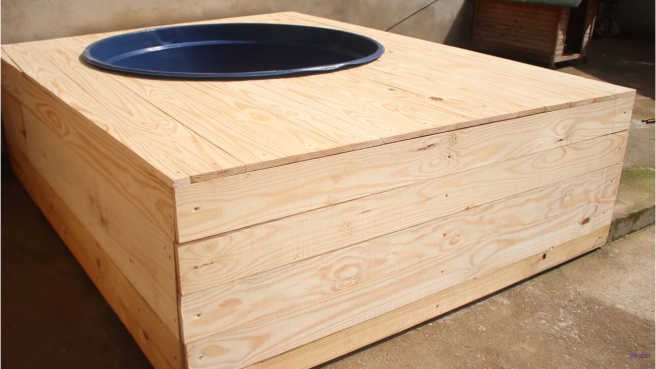 Después de eso, ella posicionó la caja de agua en el lugar definitivo y construyó un segundo cuadrado más pequeño a su alrededor, asegurando que la piscina quedara bien firme. En total, se hicieron dos cuadrados estructurales, uno mayor y otro menor, ambos con encajes hechos mediante rebajos en los extremos de las maderas para permitir una mejor fijación.