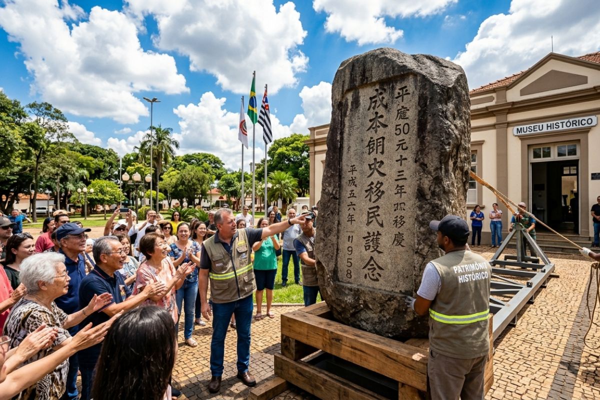 Pedra de 400 kg con inscripción japonesa desaparece por más de 45 años y reaparece en Adamantina: monumento de 1958 por los 50 años de la inmigración va al museo y se convierte en acervo histórico.