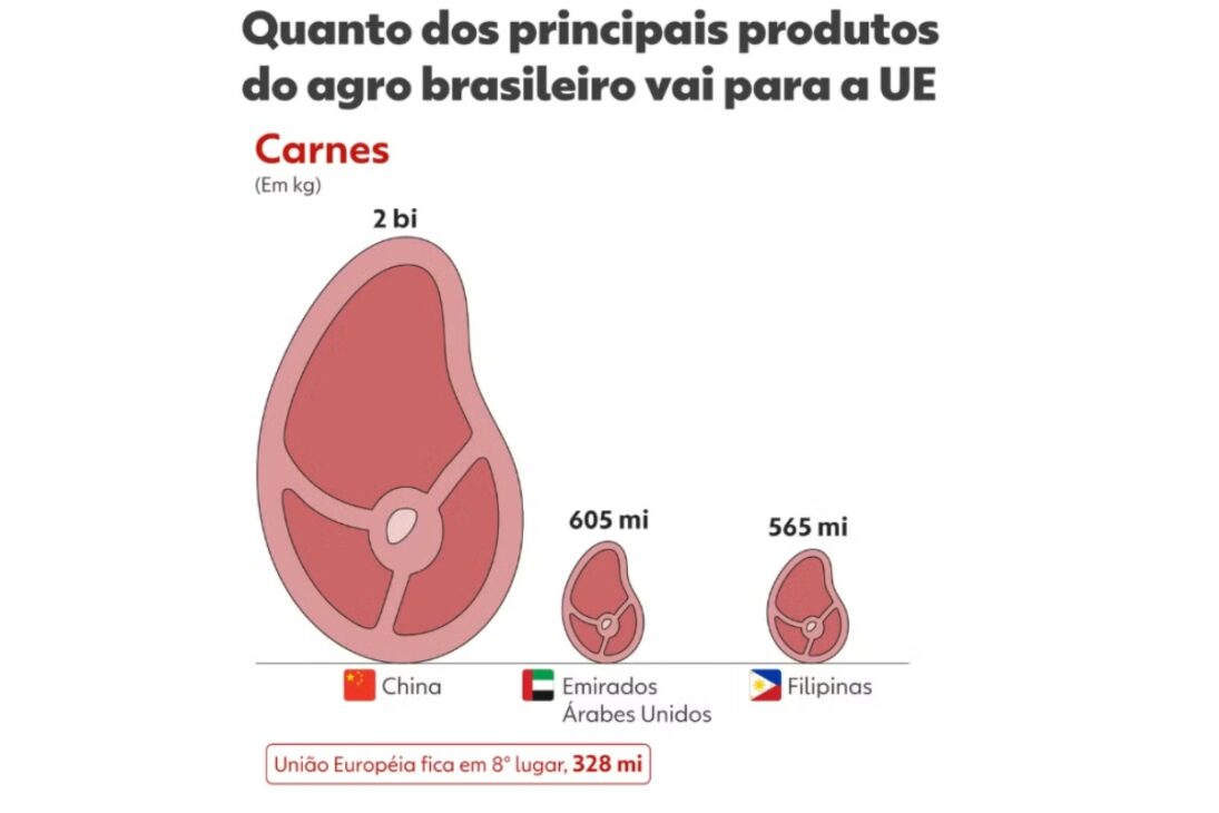 Para otros tipos de carne bovina, la tarifa actual es del 12,8% más 221,1 euros por 100 kg. Con la entrada en vigor del acuerdo UE-Mercosur, según la Abiec, Brasil dejaría de pagar este arancel al empezar a operar con una nueva cuota conjunta con los demás países del bloque. Por el tratado, Brasil, Argentina, Uruguay y Paraguay podrían exportar juntos hasta 99 mil toneladas al año, con una tarifa inicial del 7,5%.