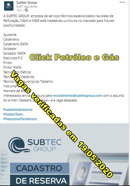 Interesados en las ofertas mencionadas, envíen el currículo actualizado a reclutamiento@subtecgroup.com informando en el campo asunto: Registro de reserva – y la oferta deseada.