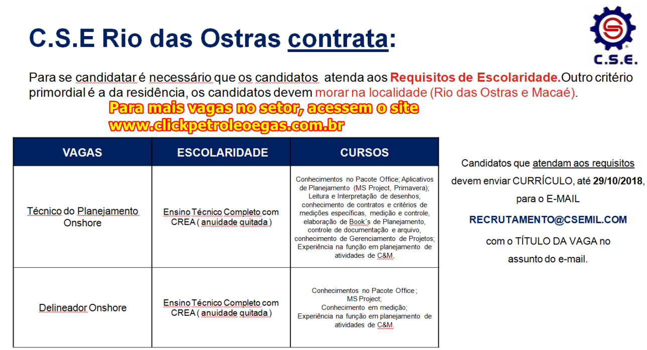 Para las vacantes de Auxiliar de Plataforma y Guindasteiro, los currículos deberán ser enviados hasta el 23 de octubre. Para las oportunidades de Técnico de Planeamiento y Delineador, el plazo se extenderá hasta el 29 de octubre. Para las funciones offshore, será necesario el curso de CBSP (faltando un mínimo de 6 meses para el vencimiento) y la prioridad es para residentes del estado de Rio de Janeiro. Los interesados pueden enviar sus currículos a recrutamento@csemil.com, informando el nombre del cargo y si ya han sido empleados de CSE anteriormente. Si desean más vacantes offshore actualizadas, hagan clic aquí y consulten más algunas oportunidades hoy.