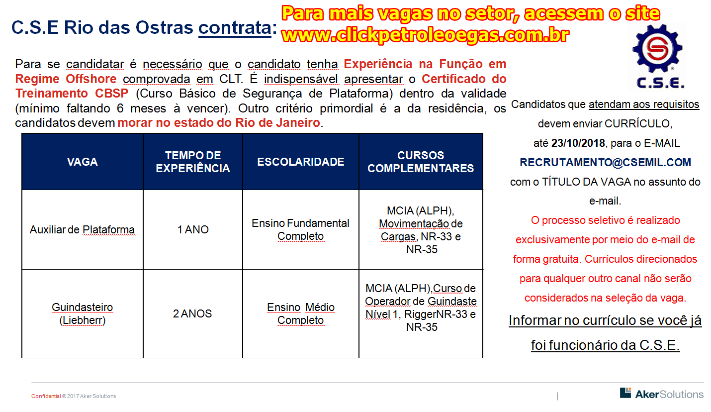 Independientemente del feriado prolongado, Aker Solutions se mantiene a pleno vapor y divulga más vacantes offshore y onshore este 15 de octubre, información oficial y reciente a través del Recursos Humanos de la empresa. Vale recordar que la empresa que el 18 de septiembre, la noruega, ganó el mayor contrato de servicios offshore en Brasil, lo que aumentará significativamente el número de empleos y contrataciones, principalmente en 2019. Para hoy, verifiquen los cargos actualizados, al final del artículo podrán consultar las fuentes: