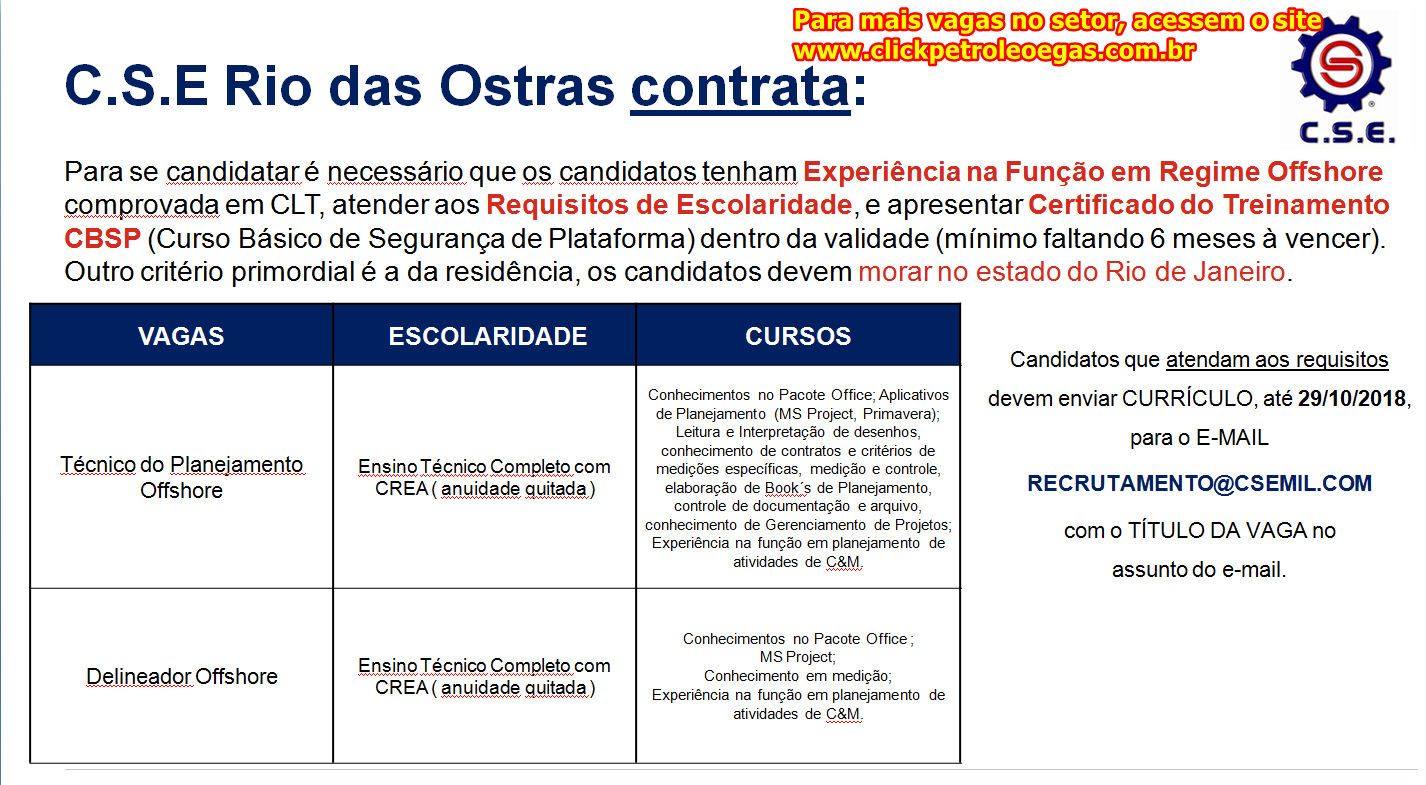Para las vacantes de Auxiliar de Plataforma y Guindasteiro, los currículos deberán ser enviados hasta el 23 de octubre. Para las oportunidades de Técnico de Planeamiento y Delineador, el plazo se extenderá hasta el 29 de octubre. Para las funciones offshore, será necesario el curso de CBSP (faltando un mínimo de 6 meses para el vencimiento) y la prioridad es para residentes del estado de Rio de Janeiro. Los interesados pueden enviar sus currículos a recrutamento@csemil.com, informando el nombre del cargo y si ya han sido empleados de CSE anteriormente. Si desean más vacantes offshore actualizadas, hagan clic aquí y consulten más algunas oportunidades hoy.