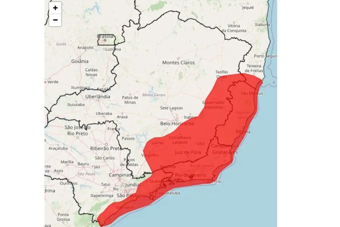 Más de seiscientas ciudades de Minas Gerais, Río de Janeiro, São Paulo y Espírito Santo entraron en un nivel de alerta máximo con el aviso rojo del Inmet este martes, 24. La señalización de “gran peligro” apunta a una combinación crítica: lluvia muy intensa en poco tiempo y alta probabilidad de impactos severos.