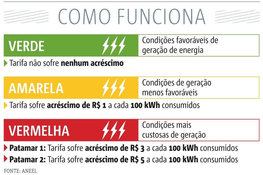 La bandera Verde indica buenas condiciones de generación de energía y no hay ningún aumento en la factura de luz. La bandera Amarilla indica condiciones menos favorables de generación, con la factura recibiendo un aumento de R$ 0,01874 por cada kWh.