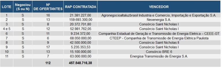 La subasta se llevó a cabo en la sede de B3, en São Paulo, y atrajo a las principales empresas del sector. Todos los lotes fueron adquiridos, algunos de los cuales fueron fuertemente cuestionados y con un descuento de más del 70% respecto a la remuneración máxima fijada por el gobierno.