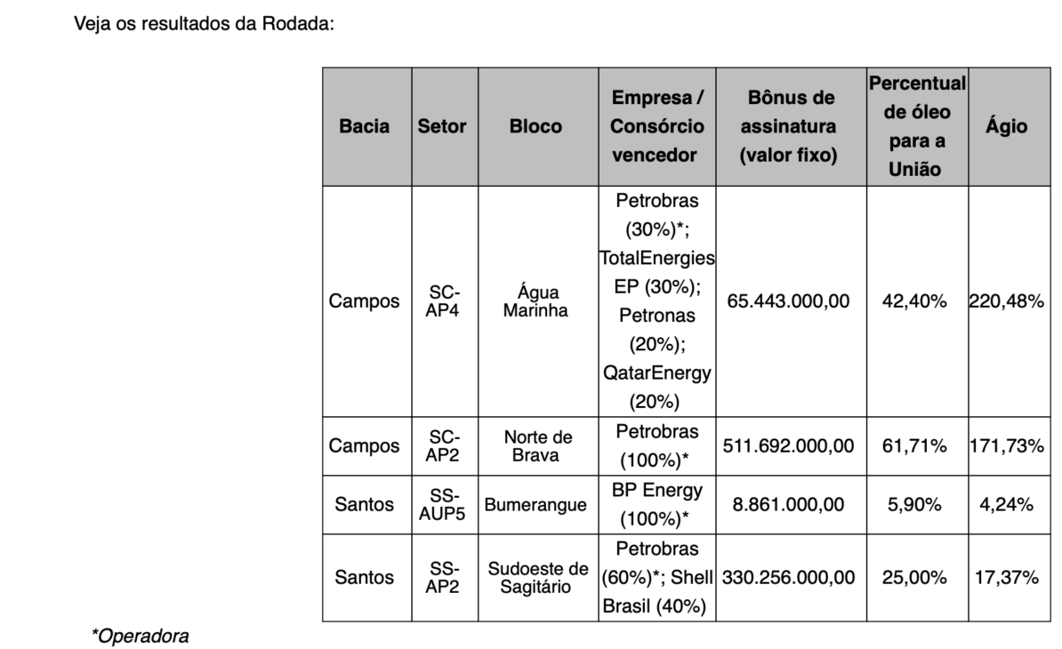 También destacó el hecho de que dos de las áreas, Agua Marinha y Norte de Brava, tuvieron competencia. “En Agua Marinha, el porcentaje mínimo de excedente en petróleo se superó en un 220% y, en el caso de Norte de Brava, el porcentaje ofertado tuvo un ágio de casi 171,73% respecto al mínimo. Con esto, garantizamos más recursos para la sociedad brasileña también a largo plazo, a través de una mayor recaudación sobre las ganancias de la producción de petróleo derivadas de la subasta”, completó.