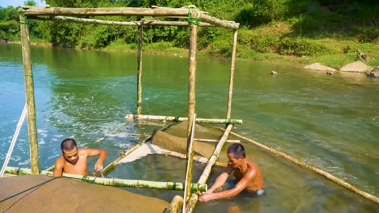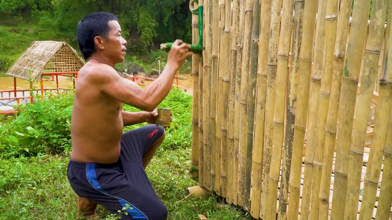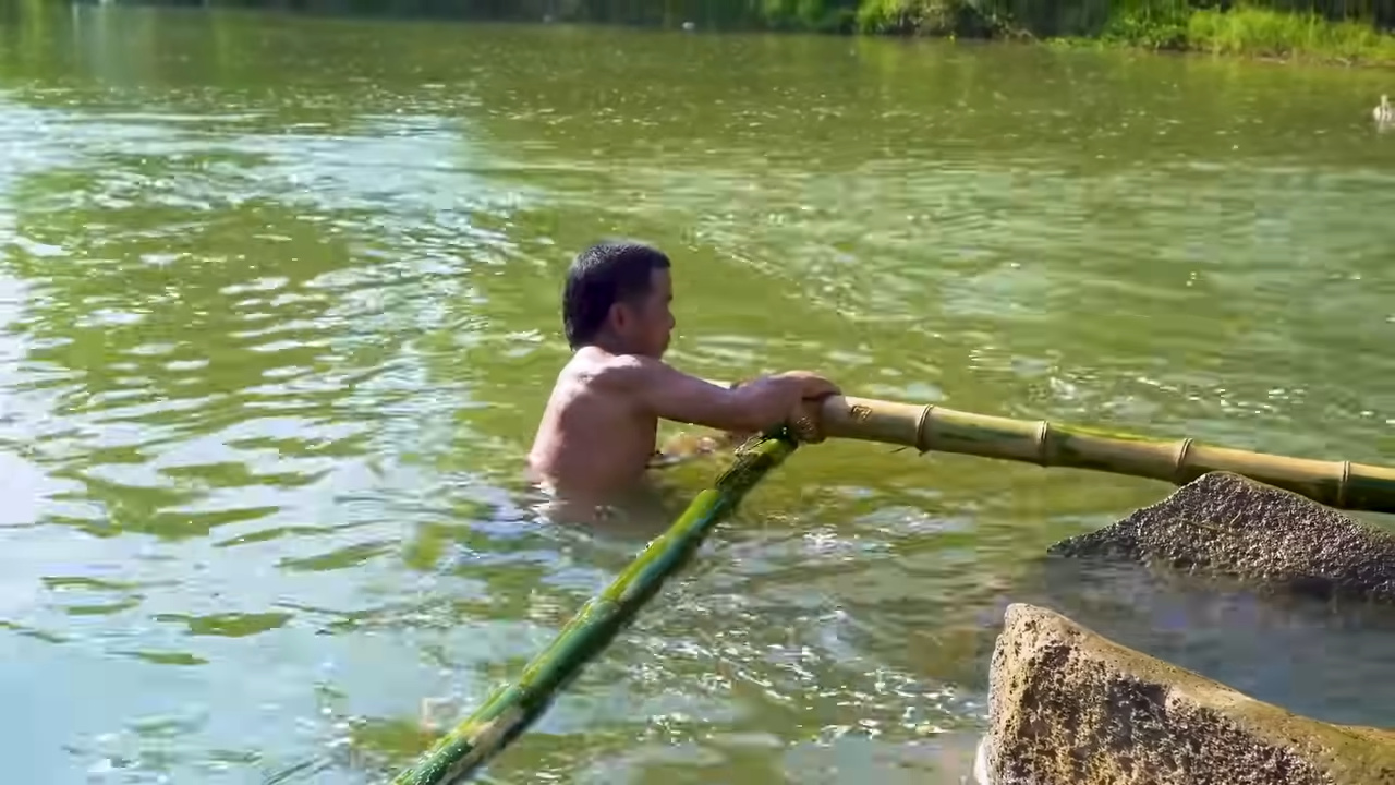 Durante un año entero, lejos de cualquier apoyo urbano, electricidad o máquinas modernas, un constructor decidió poner a prueba los límites de la ingeniería primitiva y de la supervivencia humana. El proyecto no involucró concreto, acero, motores o equipos industriales. Solo bambú extraído de la selva, piedras del lecho del río, fibras naturales, cuerdas artesanales y herramientas hechas a mano. El resultado fue una de las construcciones más impresionantes jamás vistas en el universo de la construcción primitiva: una enorme casa flotante de bambú, anclada en el río, con piscina integrada y sistemas funcionales creados desde cero.