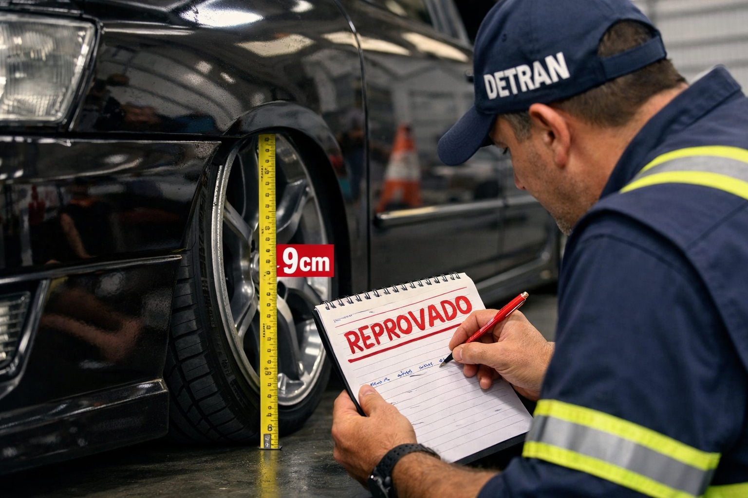 Regla del Detran: fiscalización de coches rebajados con la exigencia de 10 cm de altura mínima del suelo, provoca reprobaciones en la inspección y llama la atención de conductores y apasionados por la personalización.