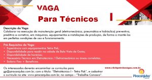 Las vacantes son para actuación en la ciudad de Bela Vista- GO, Técnicos de cualquier parte de Brasil pueden postularse