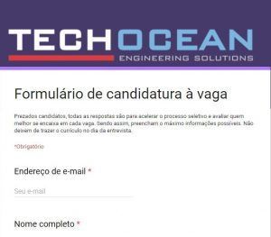 Con el fin de agilizar las entrevistas, Techocean ha puesto a disposición un formulario de Google Forms para que ustedes lo completen, no es opcional, es obligatorio. Por lo que entendemos, no hay restricciones de experiencia o demográficas, pero conociendo la naturaleza de las actividades de la empresa, candidatos más calificados tendrán prioridad en el proceso de selección. En él será posible encontrar toda la información, como por ejemplo certificados y documentos necesarios para el día de la entrevista. Completen el formulario a continuación: