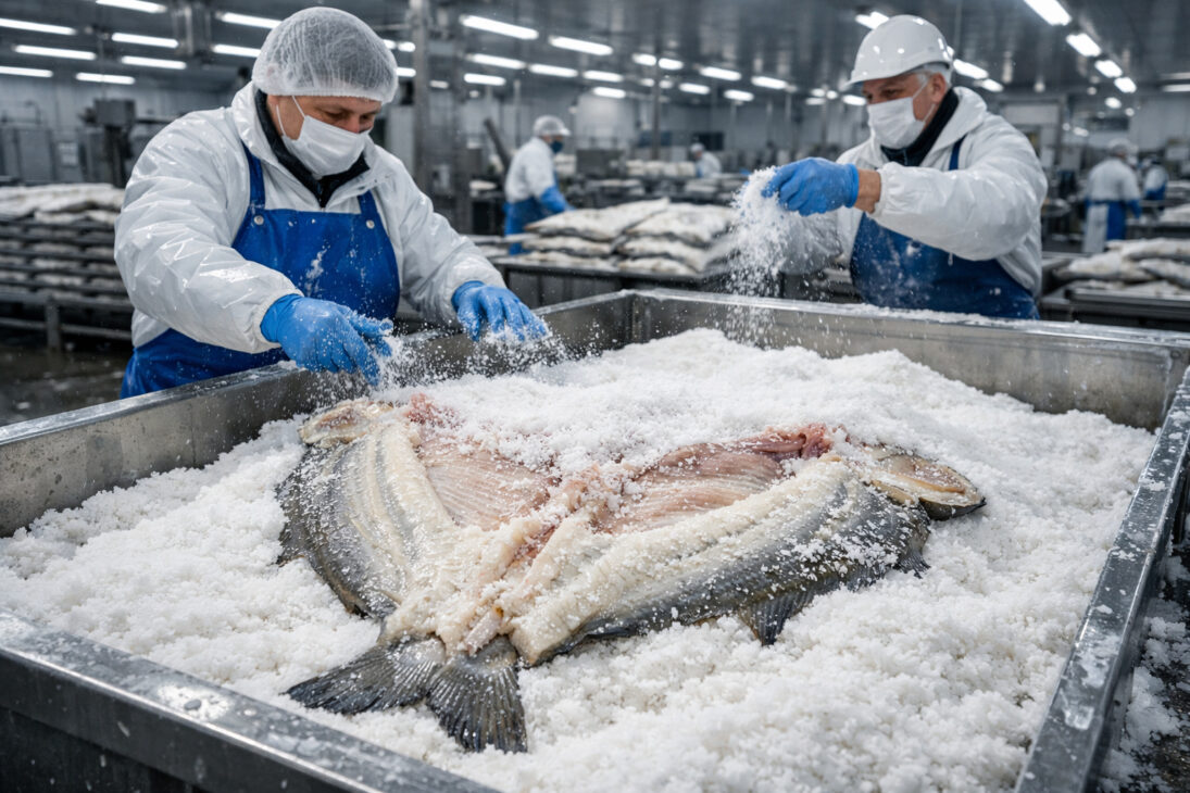 La salazón es la fase que efectivamente transforma el pez fresco en bacalao. Es ella la que garantiza la conservación, define el sabor característico y da origen a la textura firme tan apreciada. En las fábricas, los peces se organizan en capas alternadas de pez y sal grueso, permitiendo que la sal penetre de forma gradual y uniforme en la carne.