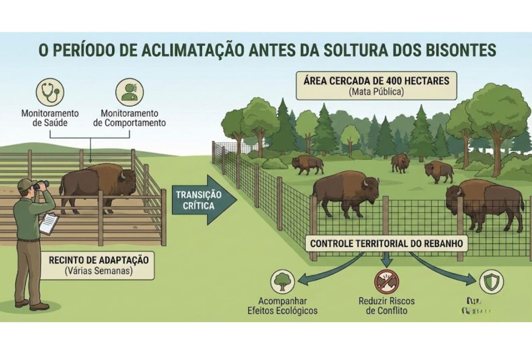 Antes de entrar plenamente en el paisaje, los bisontes permanecerán varias semanas en un recinto de adaptación, con monitoreo constante de salud y comportamiento.