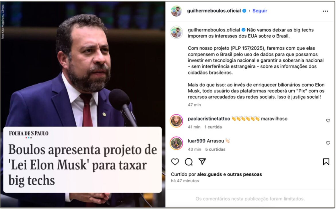 El diputado federal Guilherme Boulos (PSOL-SP) presentó, el 23 de julio de 2025, el Proyecto De Ley Complementaria 157/2025, que instituye una nueva imposición sobre grandes empresas de tecnología que operan en Brasil.