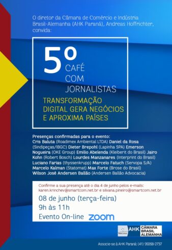 En su 5ª edición, adaptada al formato virtual, la Cámara de Comercio e Industria Brasil-Alemania (AHK Paraná) realiza el martes, 8 de junio, a partir de las 9 horas, otro Café con Periodistas, encuentro anual, exclusivo y gratuito para los profesionales de la prensa.