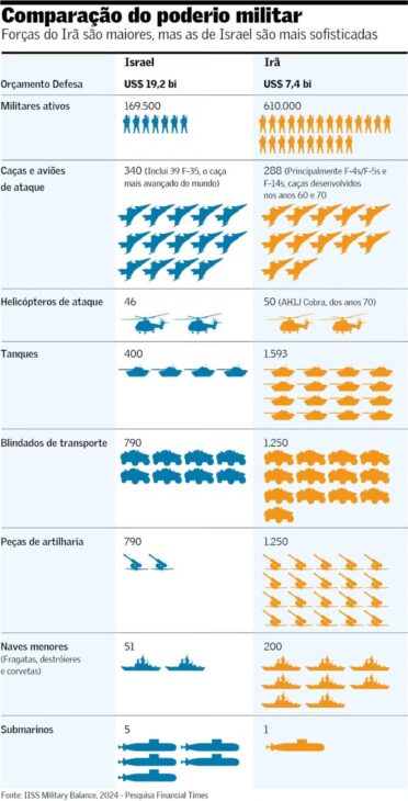 Aunque posee más tanques, blindados y embarcaciones ligeras que Israel, Irán aún utiliza cazas antiguos, como los F-4s y F-5s, fabricados en las décadas de 1960 y 1970. Además, su poder naval es limitado, con solo un submarino en operación.