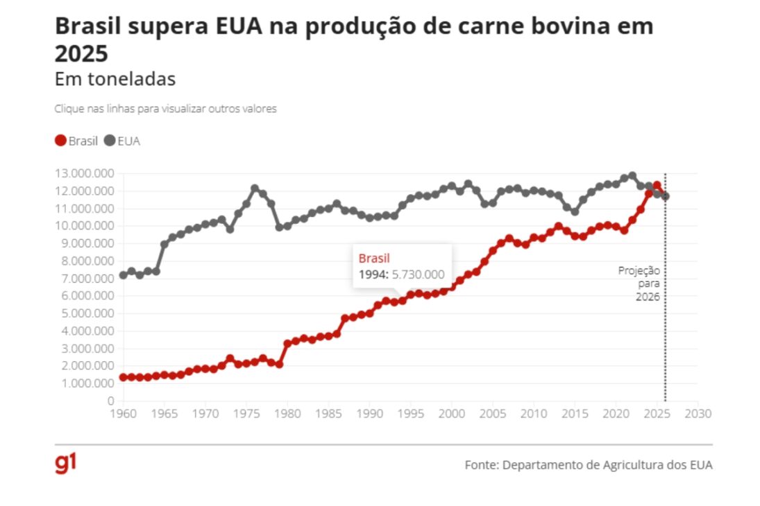 Brasil supera a los Estados Unidos y asume el 1º lugar mundial en carne bovina en 2025, mientras que 2026 ya indica un enfrentamiento ajustado