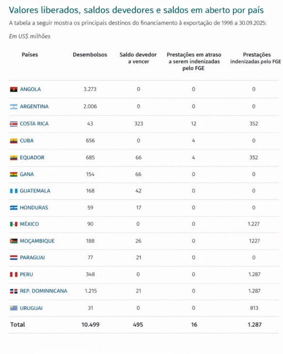 Para tratar el tema con base en datos oficiales, el portal de transparencia del BNDES trae una tabla consolidada de “valores liberados, saldos deudores y saldos en abierto por país” referente al financiamiento a la exportación en el período de 1998 hasta 30/09/2025, con valores expresados en US$ millones. En esa base, Venezuela aparece con US$ 1.507 millones en desembolsos y con US$ 813 millones en “prestaciones indemnizadas por el FGE”.