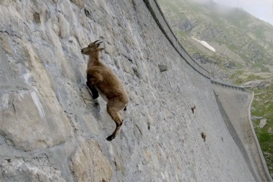 En las montañas, una cabra salvaje íbex transforma una represa casi vertical en camino diario de supervivencia. Ella sube el concreto como si fuera roca, no por terquedad, sino por necesidad: sal y minerales esenciales disueltos en el agua que escurre por la estructura.