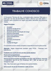 La Termoeléctrica GNA I Que Está Siendo Construida Por Andrade Gutierrez En Esta Primera Fase, Está Avanzada Y Para Complementar La Mano De Obra Que Será Necesaria Dentro De Algunos Meses, Ella Y La GNA AÇÚ (joint venture Formada Por Prumo Logística, BP Y Siemens) Están Registrando Hasta Abril De 2019 Profesionales Del Área. De La Misma Forma Hecha Por La Superintendencia De Trabajo Y Renta De São João Da Barra En El Día 11, Hoy Es Directo Con Estas Empresas. Vean Los Cargos Disponibles: