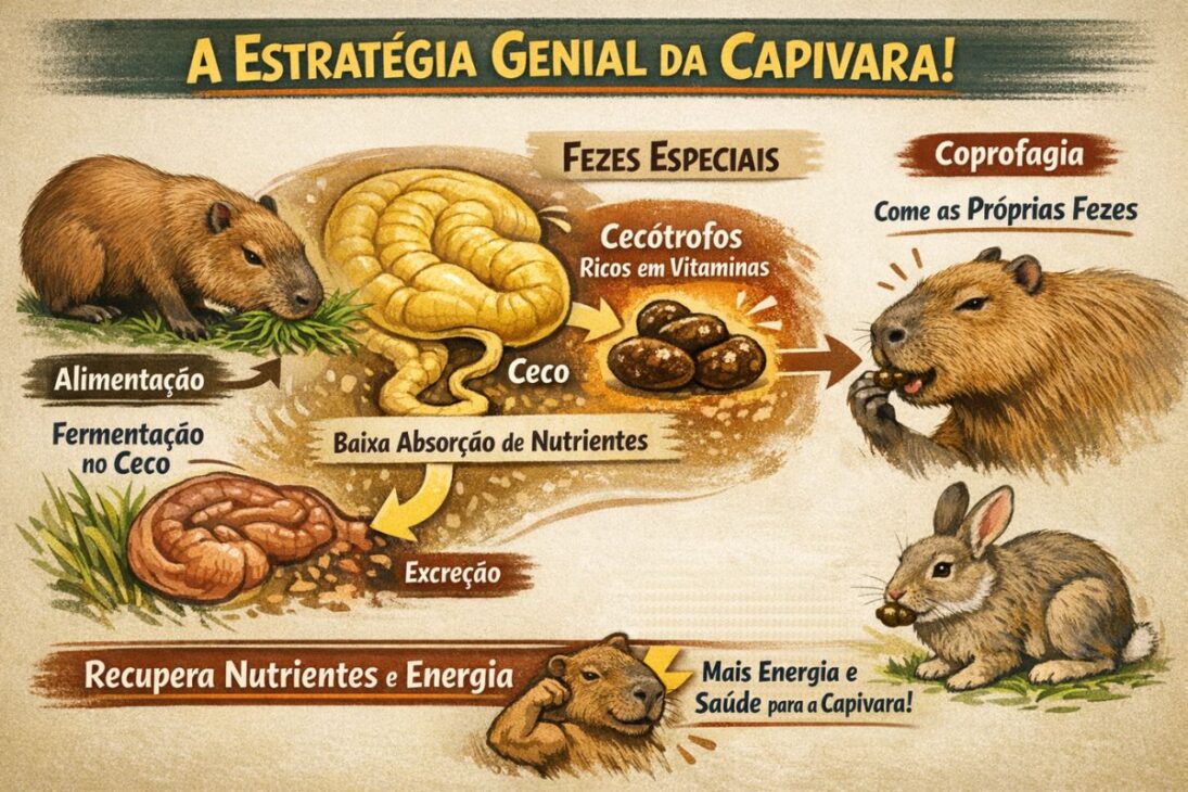 La capibara tiene un ciego muy desarrollado, que funciona como una cámara de fermentación natural. Microorganismos descomponen las fibras vegetales que el animal no podría digerir por sí solo, liberando nutrientes importantes.