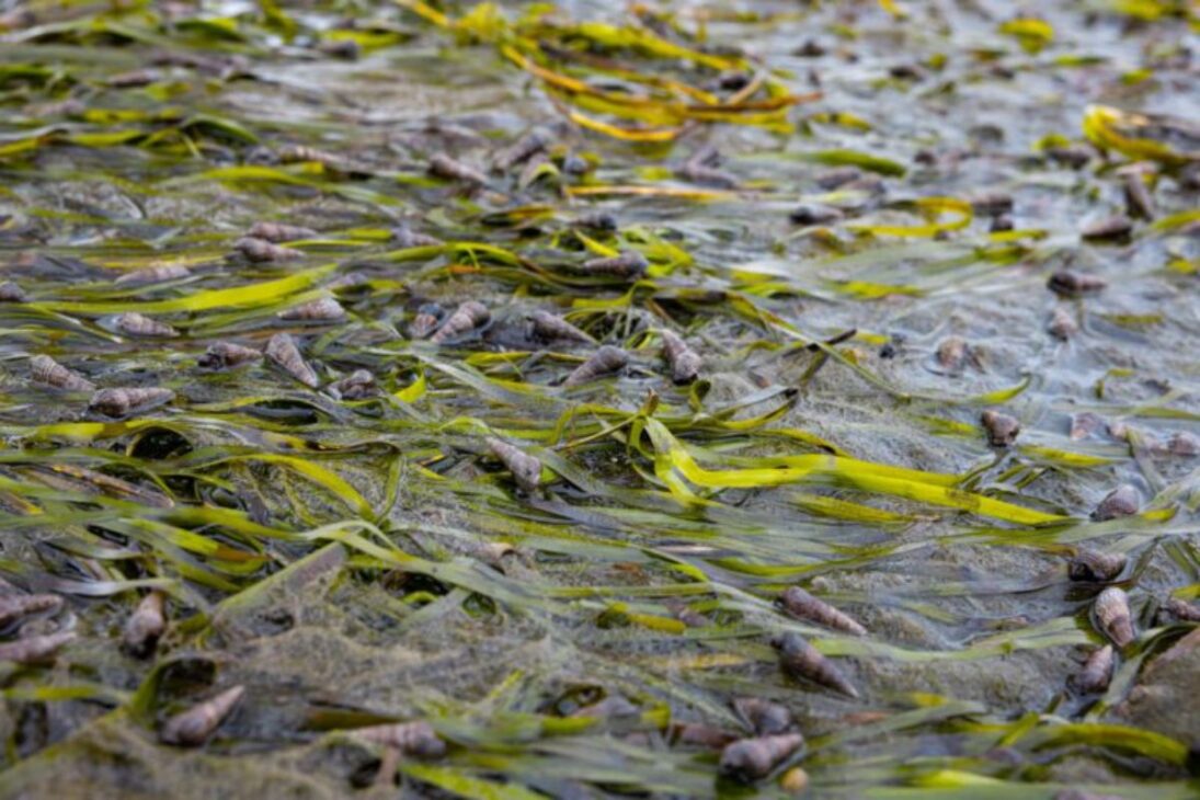 Entre las gramíneas marinas, los investigadores también encontraron decenas de caracoles de lodo japoneses, otra criatura invasora. La estimación es de miles de millones de estos caracoles solo en la Bahía de Padilla, añadiendo otro elemento de presión al prado.