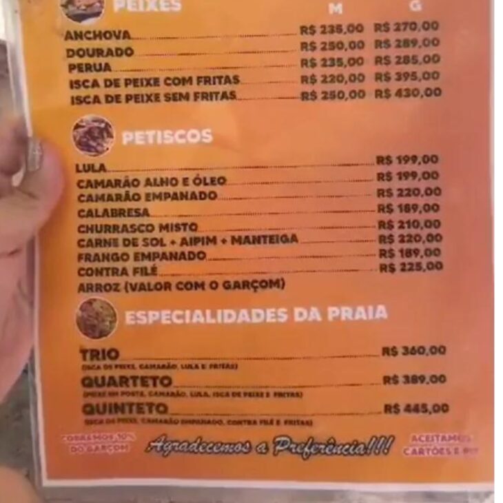 Las críticas también llegaron a la Praia de Geribá, en Armação dos Búzios, con énfasis en comidas simples con precios elevados. Un ejemplo citado fue filete de pollo con arroz, papas fritas y ensalada por R$ 470.