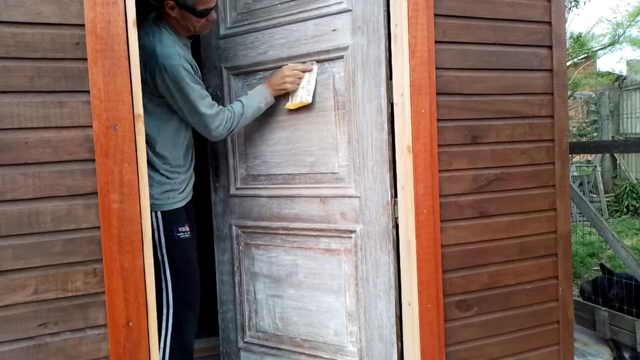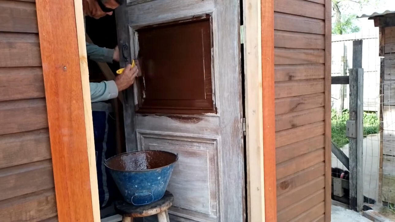 Puerta antigua puede ser revitalizada con lijado progresivo, correcciones con masa y pintura con esmalte sintético, manteniendo el batiente original y reduciendo costos en comparación a la sustitución completa.