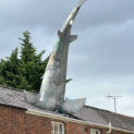Instalada en 1986, la escultura de tiburón de 7,6 metros transformó una casa en Oxford en atracción turística y símbolo urbano