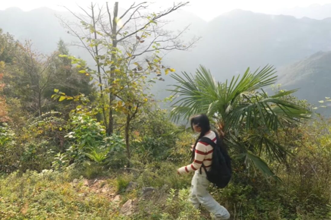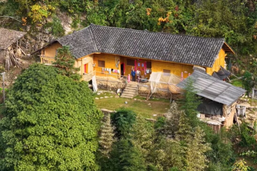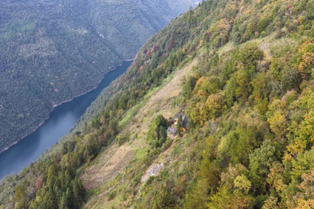 El escenario es de aislamiento total. La casa se encuentra en una ladera empinada y casi vertical, en medio de montañas imponentes que rodean todo. Abajo, el río Qingjiang corre veloz, como una línea viva que cruza el valle. Alrededor, solo bosque y desfiladeros profundos.